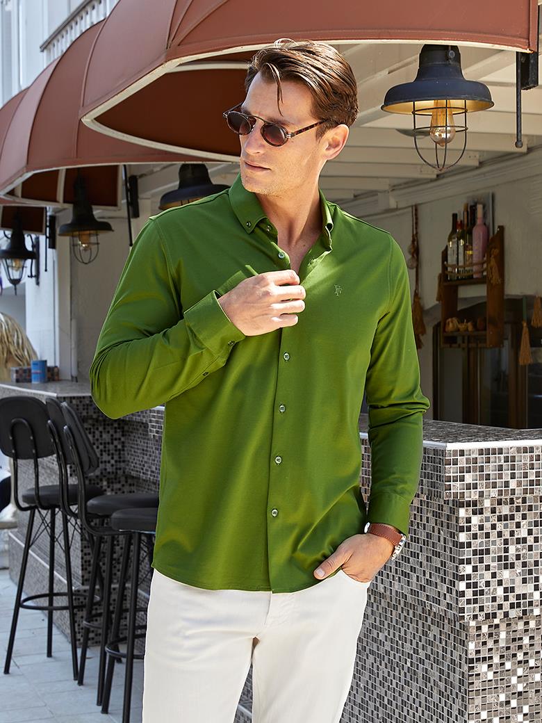 Düğmeli Yaka Normal Kesim Yeşil Merserize Gömlek